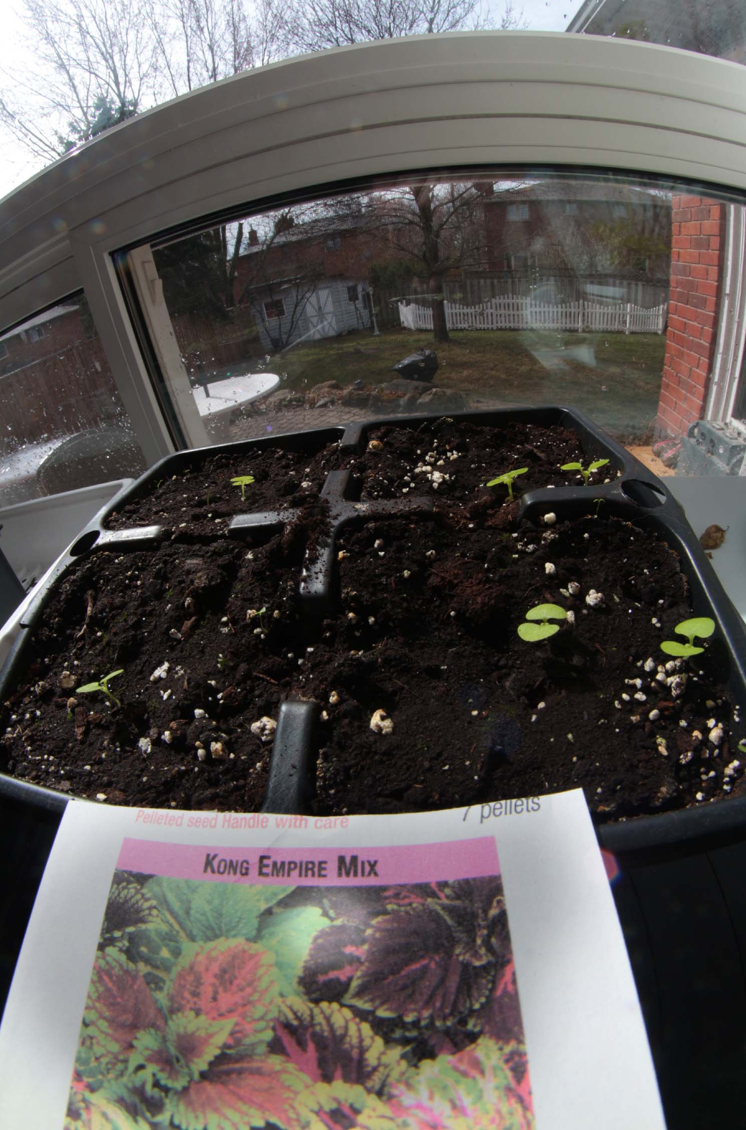 The colours are often spectacular — which is why they are so popular within my circle of friends. One of my friends calls me the Coleus Queen. At last count, I had 13 flowerbeds, so that’s a lot of space to fill. It’s way more economical to grow from seed, and fortunately, this is one plant that has rewarded my efforts. Accordingly, in February I went with a good friend and fellow garden enthusiast to a well-known seed supplier to buy seeds as I’ve done in past years. We had a wonderful time browsing and I bought several packets of unusual vegetable and flower seeds, including the coleus. Well, after setting up all my little trays at home I opened up the packet of coleus seeds and discovered there were seven seeds in it and I paid $5.65! I normally get 80-100 seeds in a packet. Needless to say, I called the supplier and they informed me, that was correct, as I had purchased the “Kong” variety — as in King Kong, apparently. The lady said they were very large. I wondered how large could they be, as the coleus I’ve grown in the past have already been quite large. When I asked, the reply was that the leaves can be “nine inches long”. The Pinto variety I had grown before were sometimes that large but unfortunately they were no longer carried by this supplier. With these pricey seeds, there was no way I was going to be able to grow my usual harvest. I got on the phone to all the other seed retailers within a half-hour drive; nobody seem to carry coleus seeds. I was meeting friends for a movie the next day in Mississauga and decided to call a garden centre there. Finally, I found some. A brand I had never tried, but at a normal price ($1.89) and with dozens of seeds in the packet.