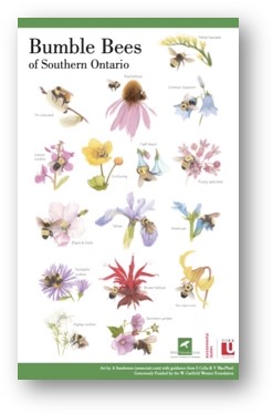The poster at right reflects the 16 species of bumble bees that currently reside in Southern Ontario. They are generalist foragers and as such do not depend on any one type of flower. They are often the first bees active in late winter and the last in fall. Since they are active for so many months, they must be able to forage on a wide variety of plant species in a wide range of weather conditions to support a colony. Early and late season food resources (blooming flowers) are critical at these times for the successful establishment and reproduction of the colony.