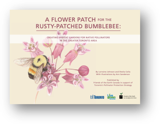 If you would like to do more and learn more about the Rusty-Patched Bumble Bee and Ontario’s native bees in general, the above booklet, published by Friends of the Earth Canada in support of Toronto’s Pollinator Protection Strategy is free to download here.