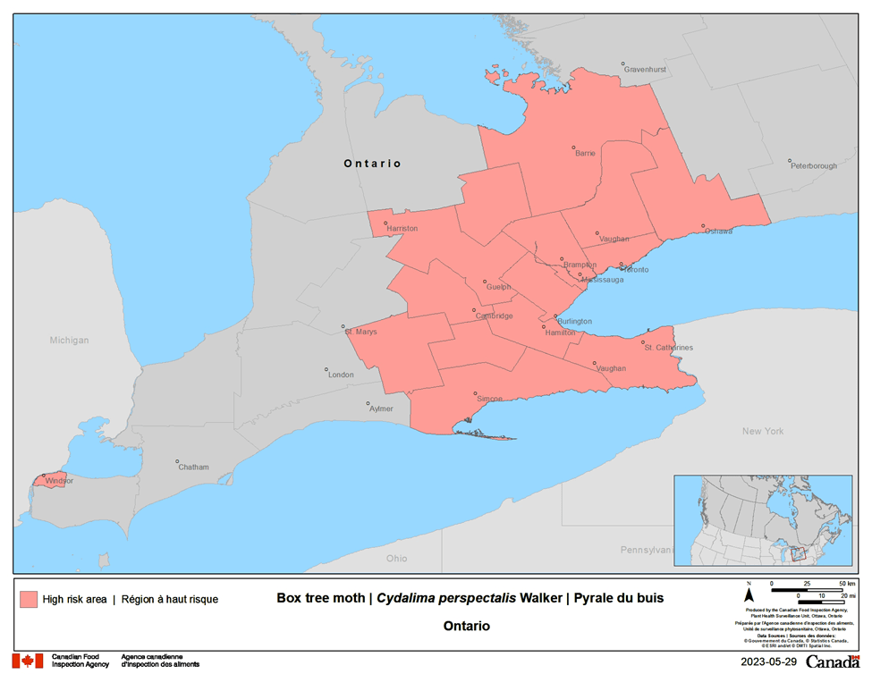 To determine the extent and distribution of boxwood moth, the CFIA (Canadian Food Inspection Agency) is asking all stakeholders to report sightings of this pest. It can be done online here. The CFIA will be interested in reporting of areas that are new rather than areas where box tree moth is already present (see map).